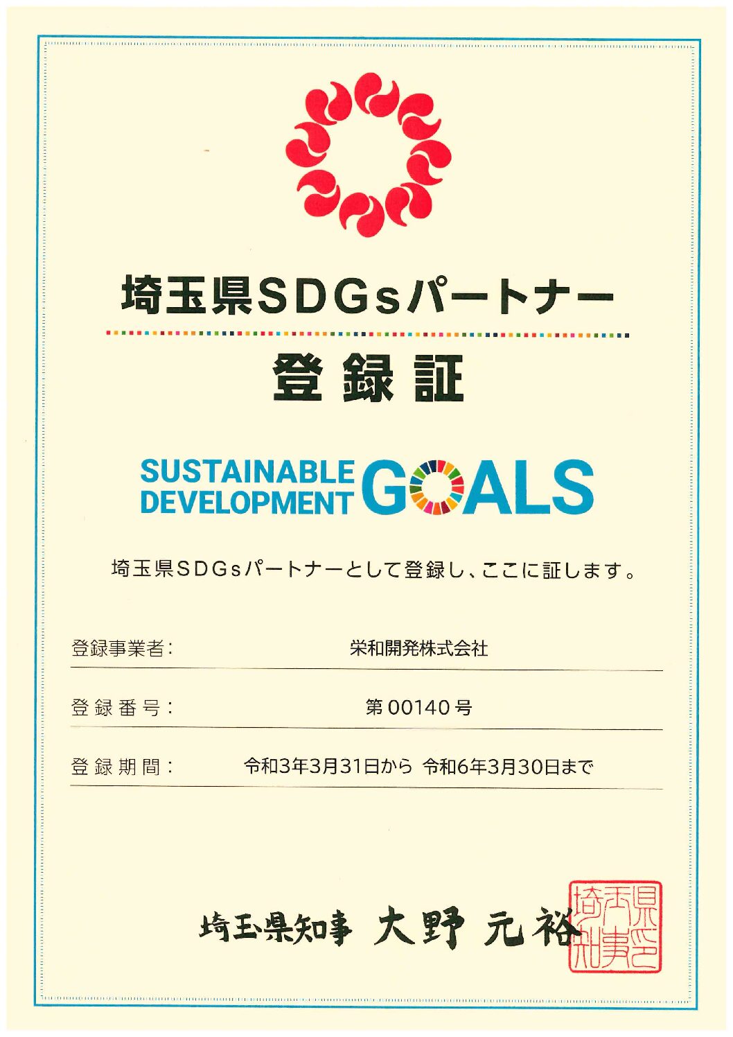 栄和開発株式会社は埼玉県SDGsパートナーに登録されました。